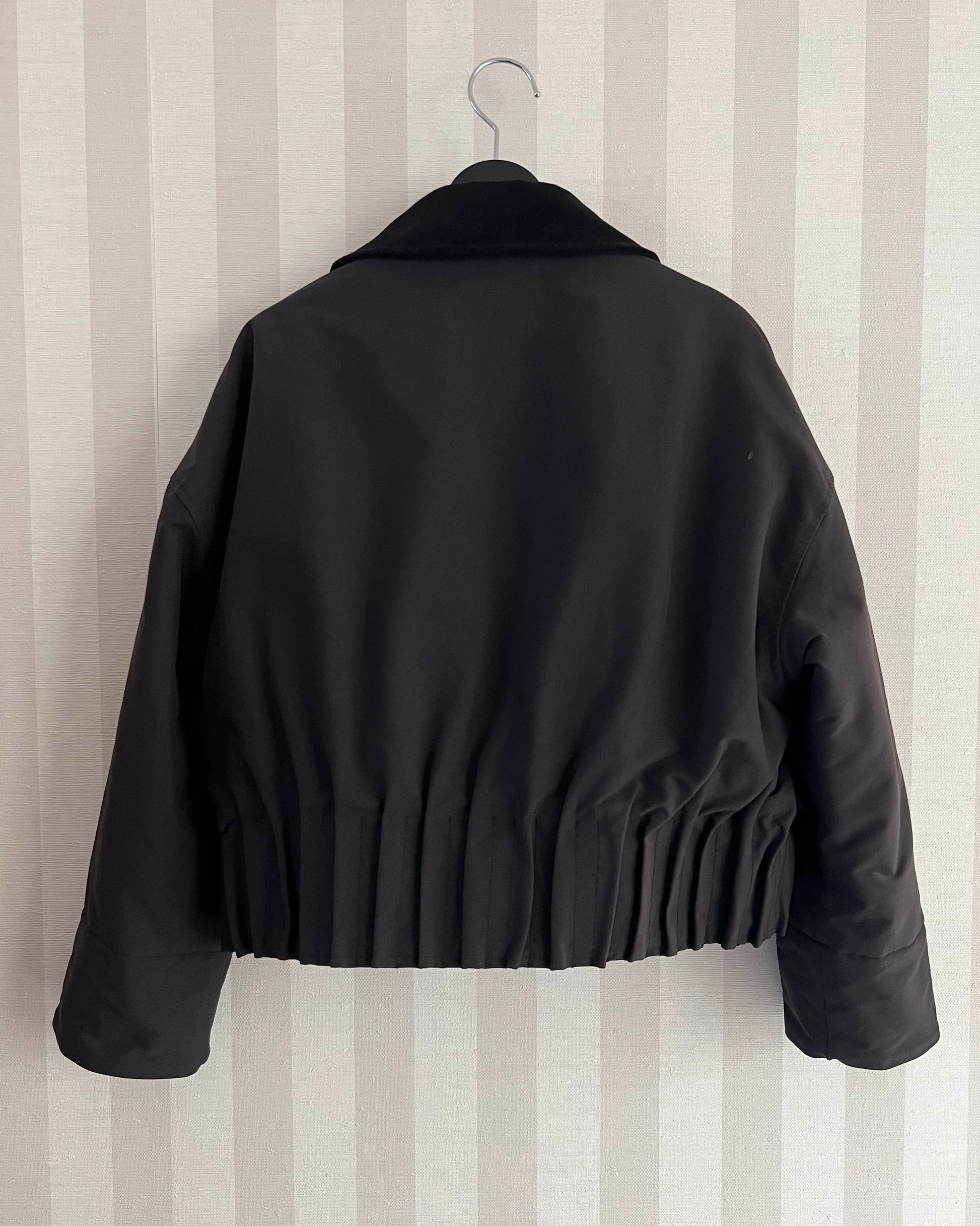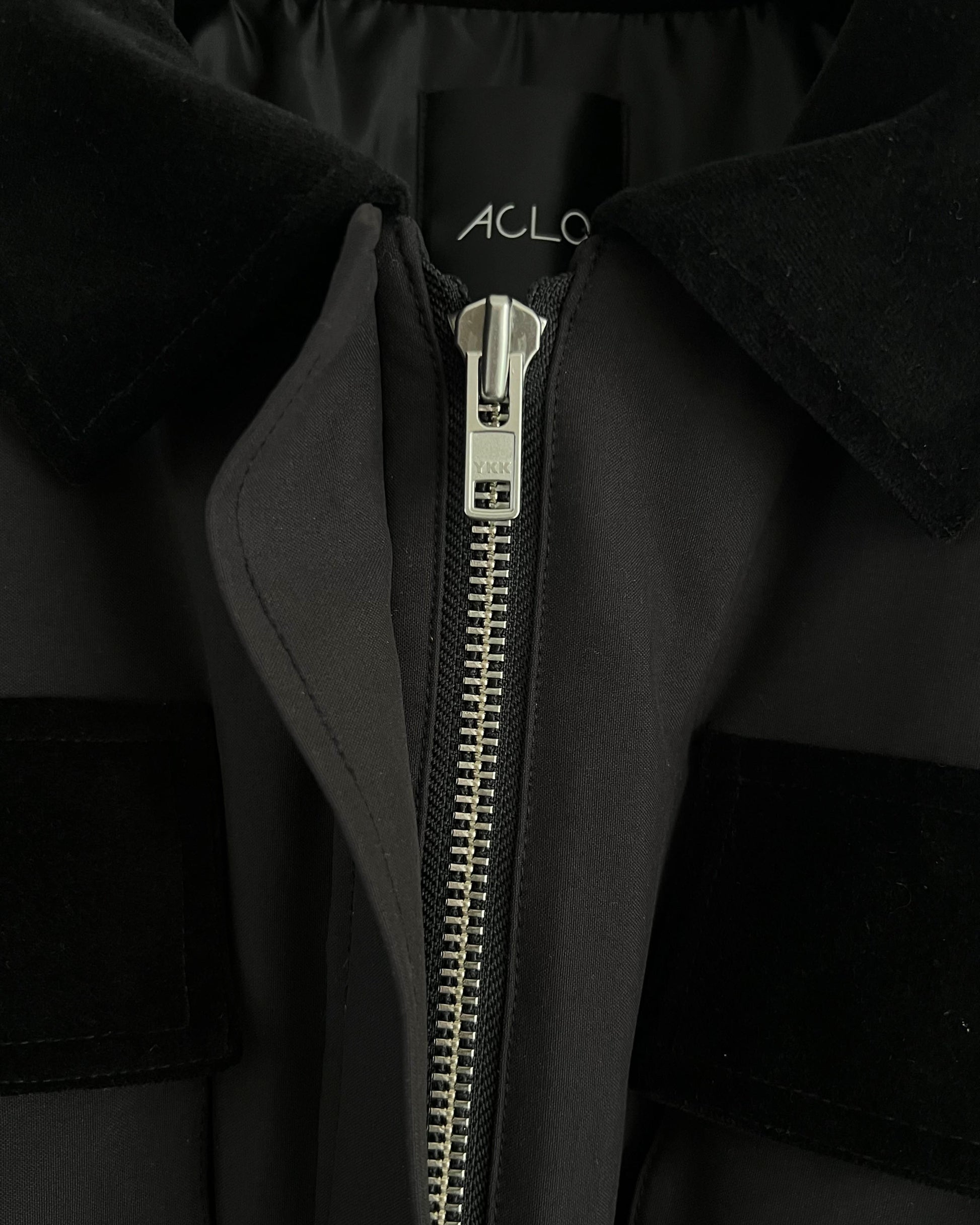 マットな質感の生地に、フラップと襟、袖口の折り返し部分にあしらわれたベロア素材が上品なアクセントを添え、ミリタリー感の中にモードな印象を与えます。